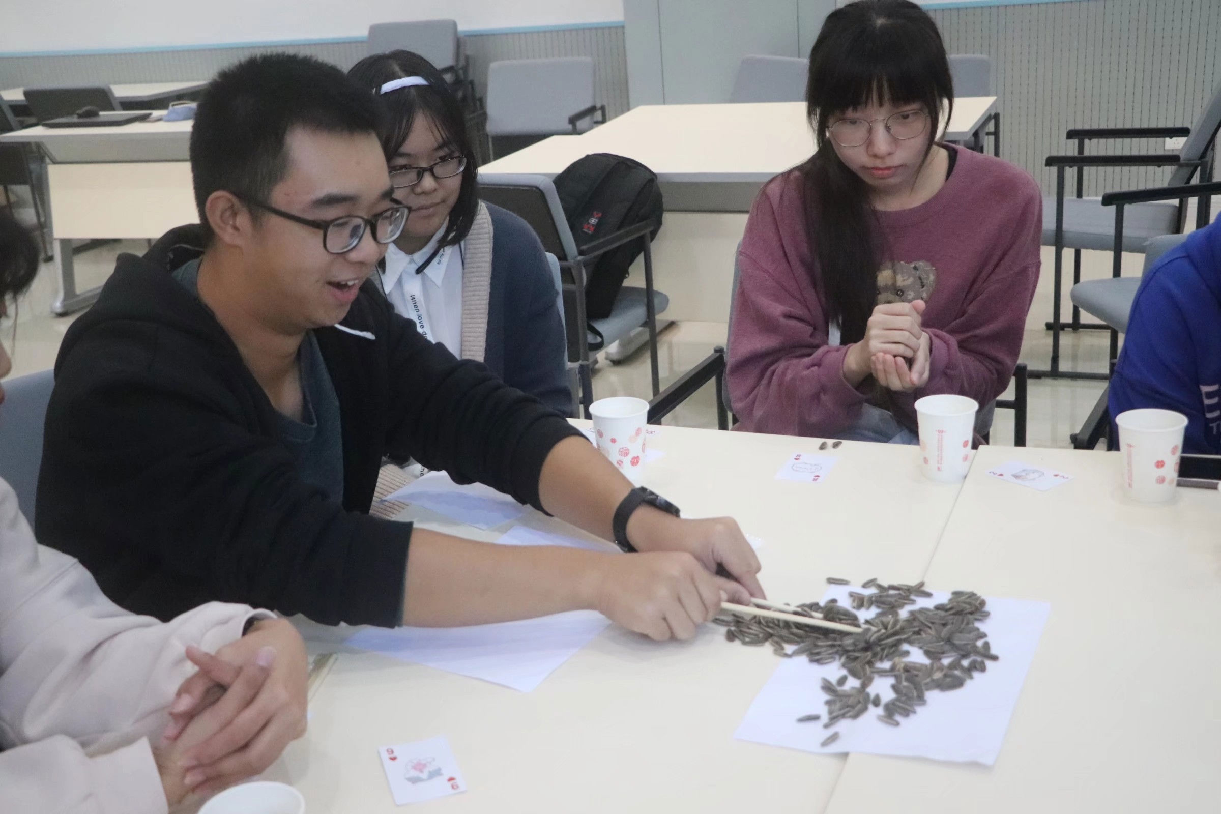 本次团辅活动由暖场环节和正式环节组成。暖场活动中大家首先通过抽扑克牌确定游戏顺序,紧接着在主持人的引导下,同学们依次进行暖场游戏“夹瓜子”,夹到瓜子最多的人能获得奖品。同学们在游戏中展示出不同的角度和奇妙的夹法,这场技巧与智慧的比拼究竟谁能笑到最后。