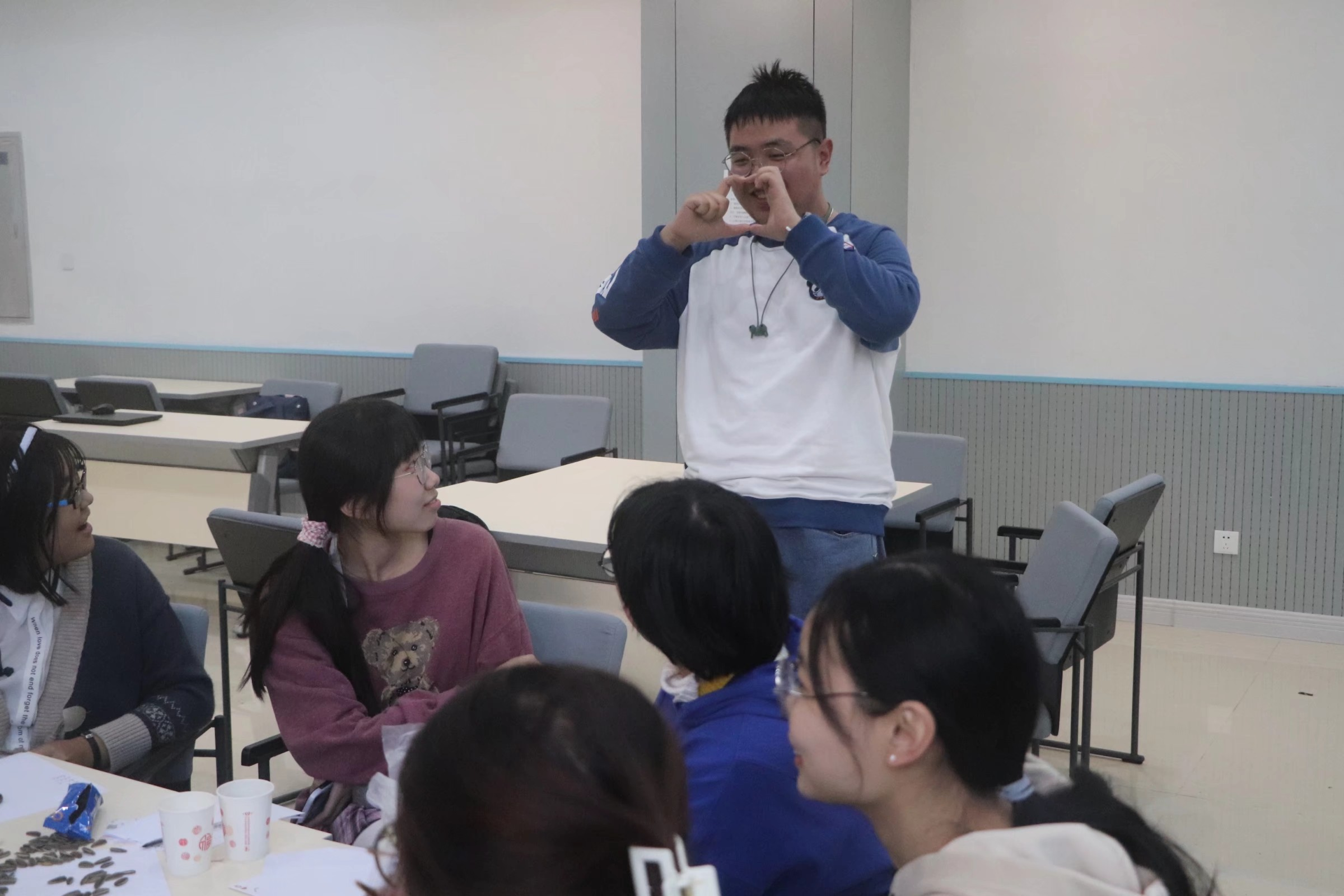 之后开始正式游戏“你划我猜”,同学们抽取对应的词语纸条,用肢体语言对其进行展示,由其他人猜测他想表达的词语。第三个游戏是“传乒乓球接力”:同学们分成两队,同队成员用筷子夹取乒乓球来回接力,最快完成接力的一组获胜。大家谨慎又迅速地传递着乒乓球,脸上的表情“变幻莫测”,引得全场欢笑不停,大家沉浸在欢声笑语中……至此,本次团辅活动接近尾声,参加本次活动的同学加深了对彼此的认识并在游戏中收获了喜悦,怀着意犹未尽的心情期待下一次团辅活动的开展。