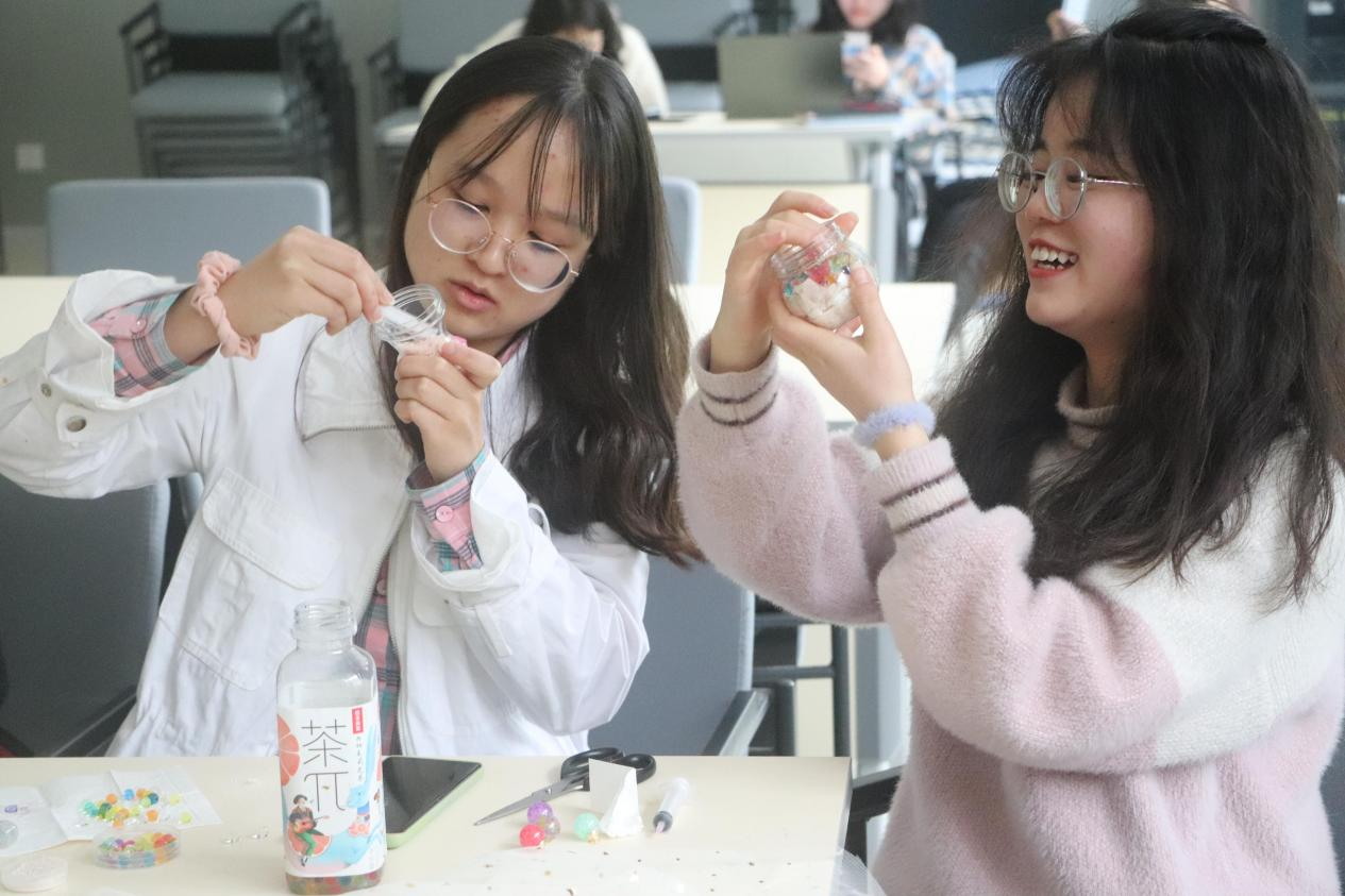 “一瓶一世界,一人一梦想,许下心愿,放飞梦想”。为充分激发同学们的创造力和想象力,本次活动以制作许愿瓶为主要内容。活动开始由主持人介绍许愿瓶的制作方法,同学们看完演示后,依次选择了自己心仪的瓶子。在之后的实践过程中,同学们热情高涨,积极参与,选取自己喜爱的饰品放入玻璃瓶中,制作自己的许愿瓶。制作过程中大家专心致志,互相帮助,体现了同学们温暖的友谊。