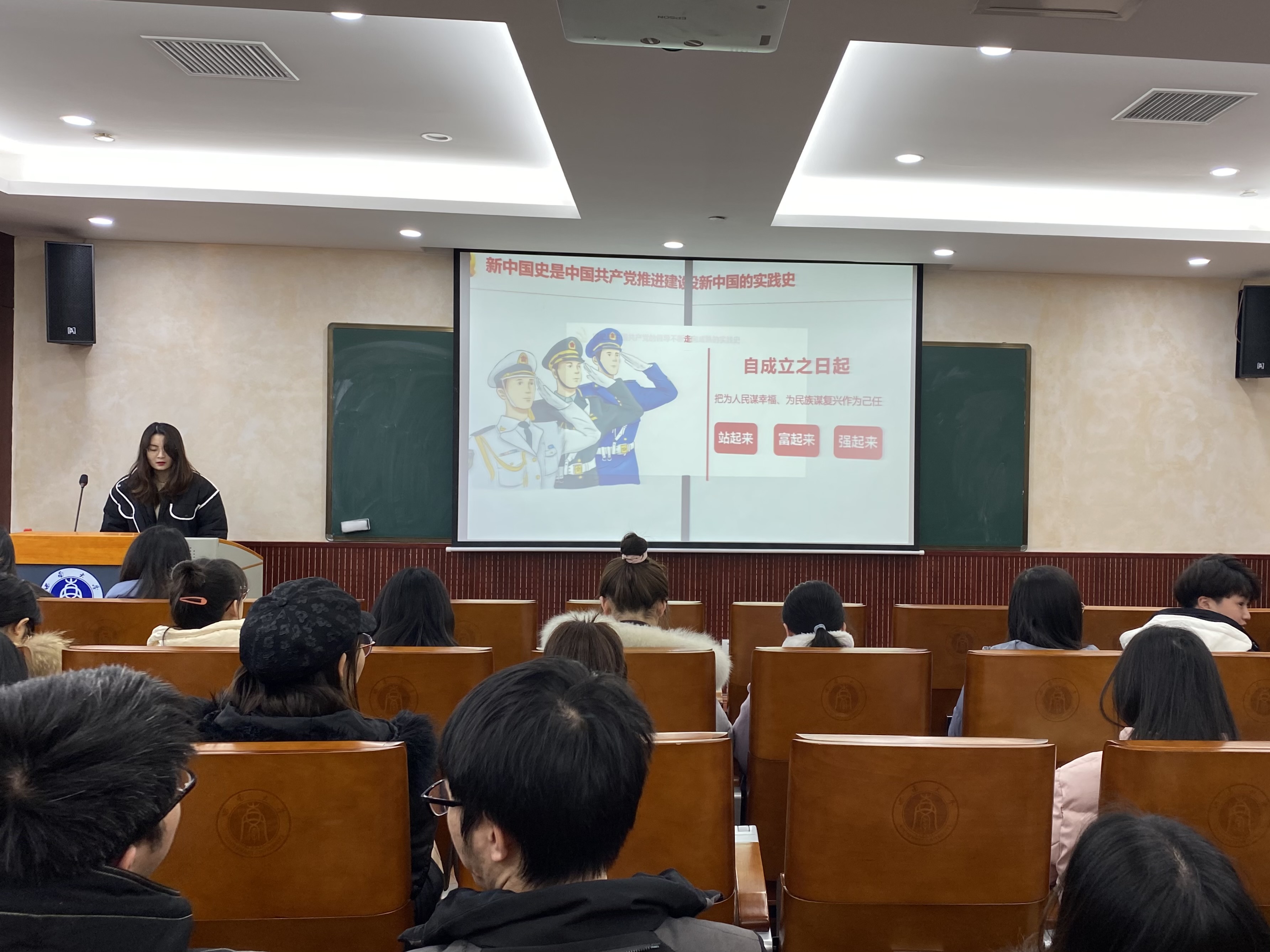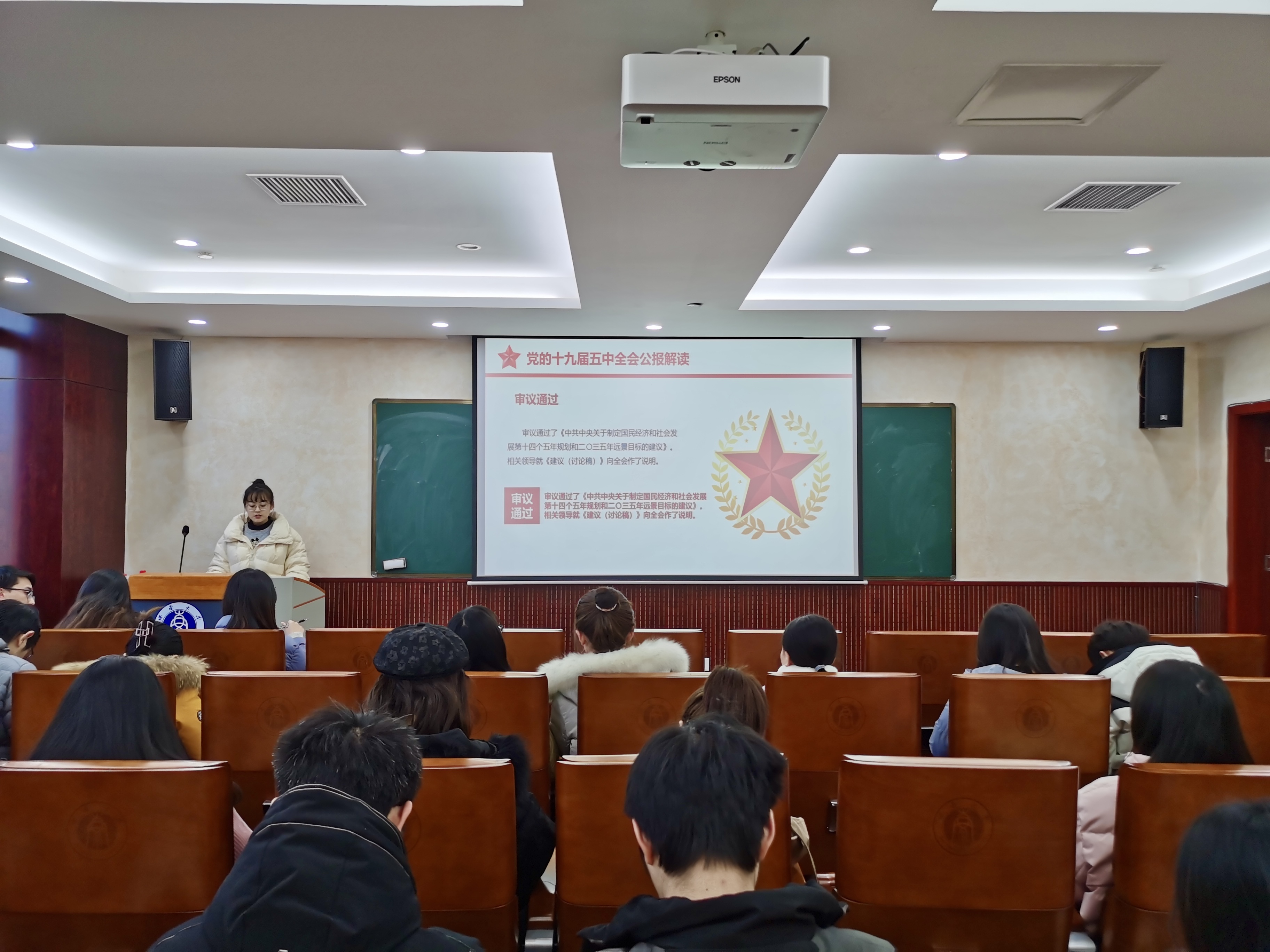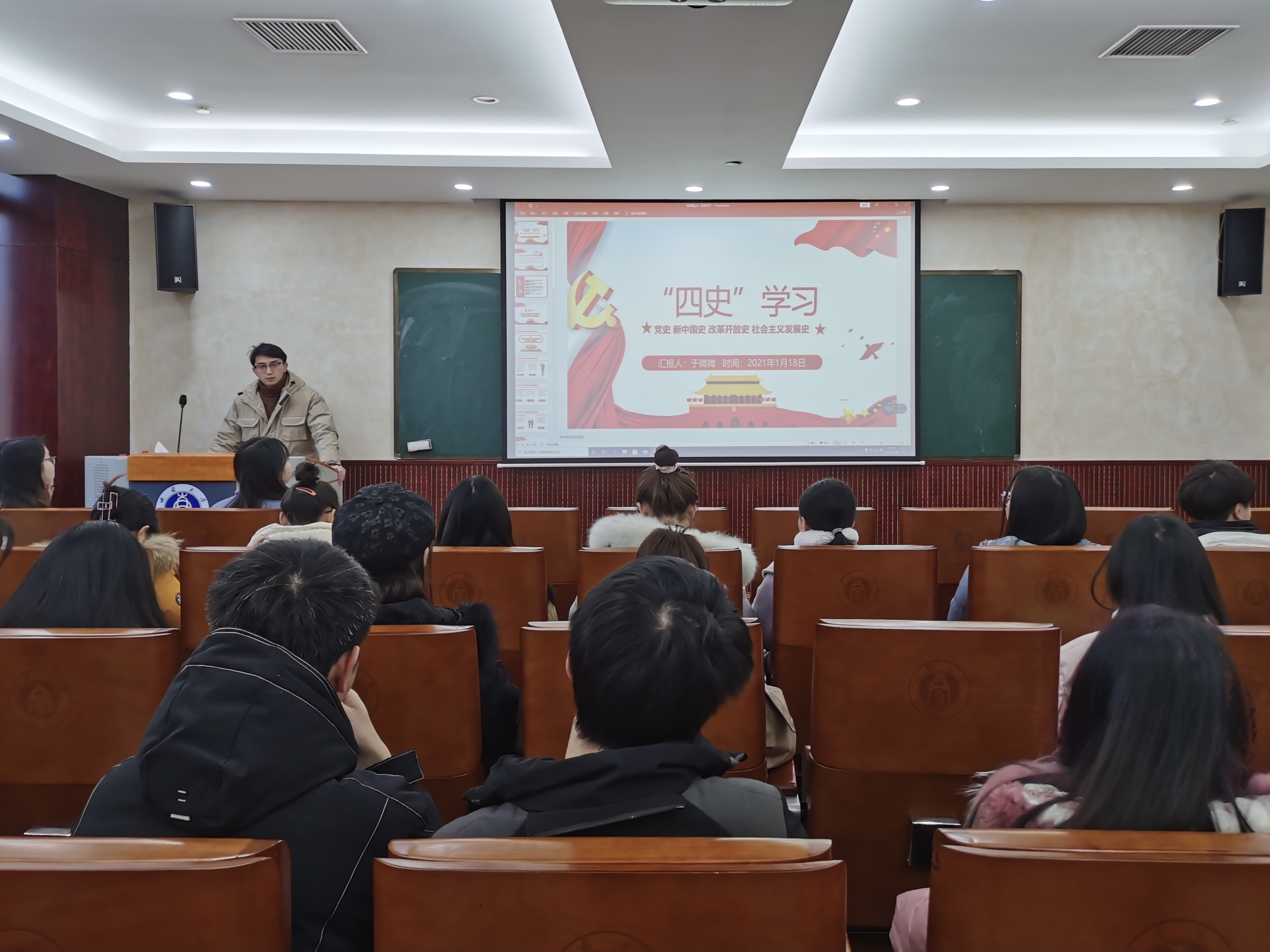 本次活动由于微微和张艺莹同学以PPT演讲的形式向同学们传达党的十九届五中全会的主要精神。于微微同学从“四史”的内容以及学习“四史”的意义两方面进行了介绍,帮助同学们更好地理解四史,身临其境地了解中国共产党的峥嵘岁月,知晓中国共产党在革命和奋斗中的艰难历程。让同学们体会到美好生活的来之不易。张艺莹同学向同学们传达此次十九届五中全会的主要精神。让同学们深刻认识到我国社会主要矛盾变化带来的新特征新要求,错综复杂的国际环境带来的新矛盾新挑战。让同学们深刻体会到当代研究生应当牢记使命不忘初心,在学习中刻苦专研,在工作上认真负责。未来祖国发展的接力棒正传递到青年人的手中,要为中华民族的伟大复兴梦砥砺前行。