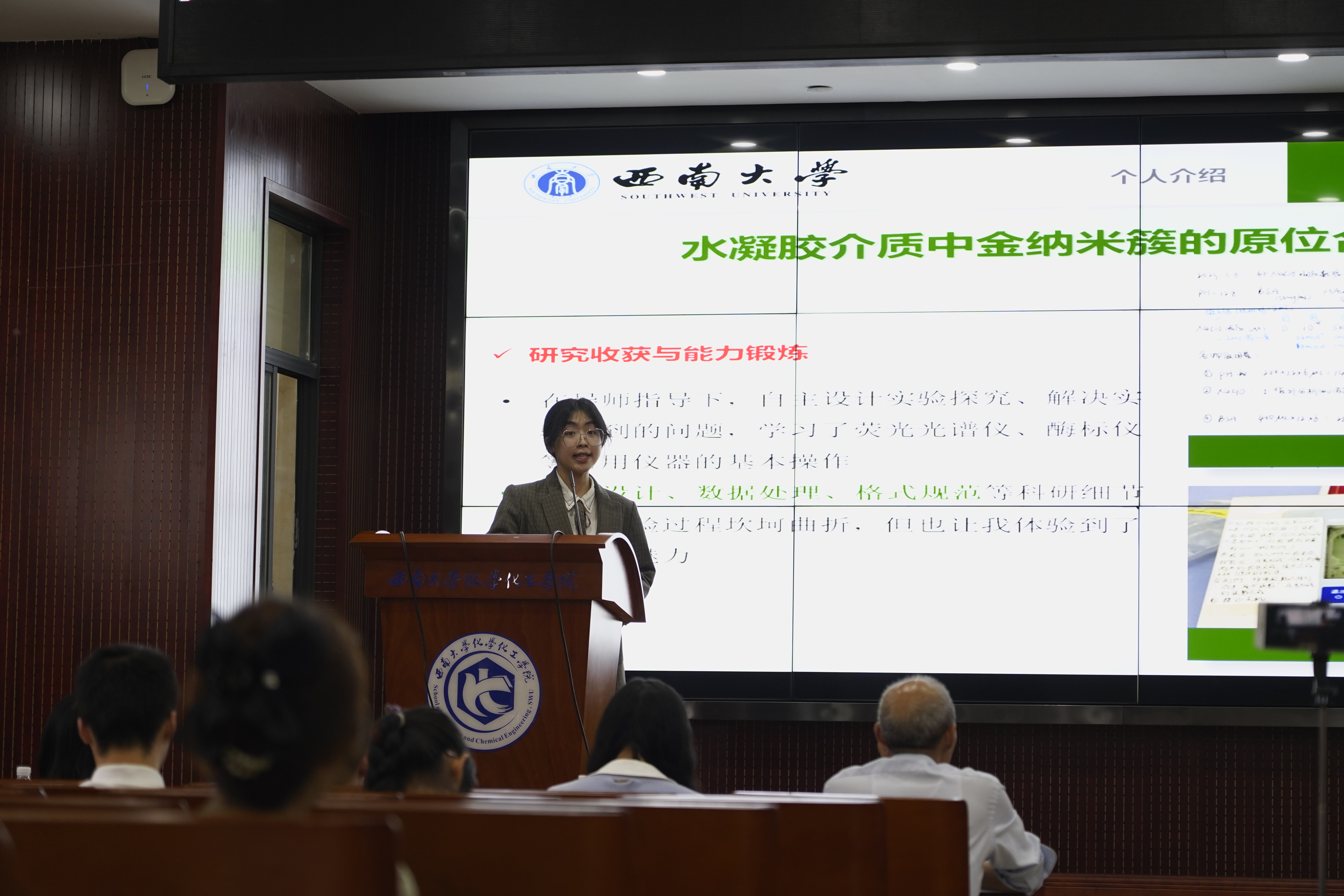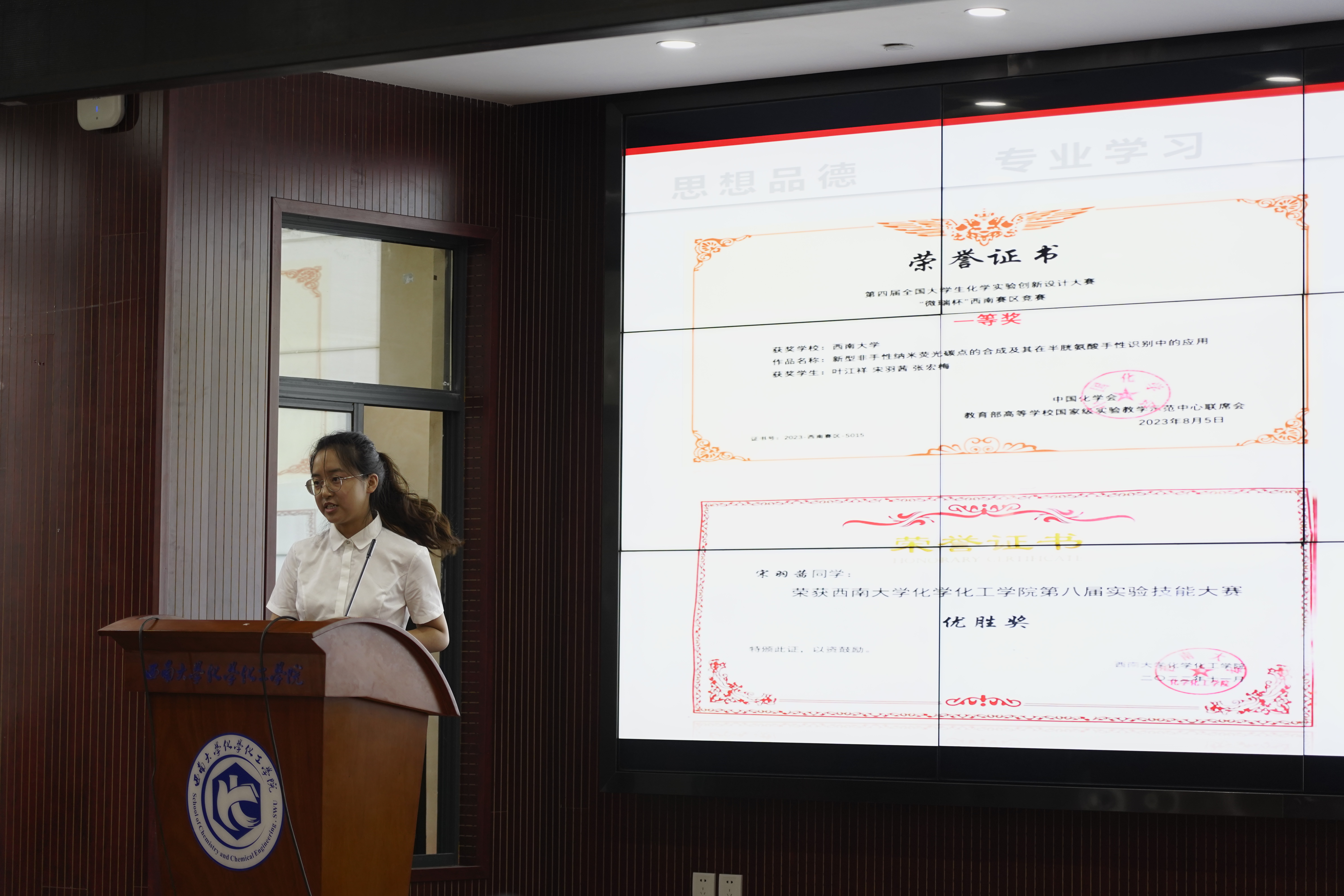 13名国奖答辩候选人依次登上舞台,分别从学习工作、科研竞赛、思想觉悟、社会实践以及未来展望等方面进行汇报。其中,20级化学师范刘依萍同学以“心之所向,素履以往”的激情积极向党组织靠拢,热心为人民服务;21级化学师范叶江祥同学以“海到天涯无作岸,山林绝顶我为峰”的志气斩获多种竞赛一等奖;21级应用化学宋羽茜同学以“台上一分钟,台下十年功”的拼搏为自己书写了青春的靓丽底色……名列前茅的专业成绩,占满屏幕的各项奖状,丰富多彩的课后实践,彰显了西大学子的刻苦专研、脚踏实地的优秀品质。自信的笑容,蓬勃的朝气,那是独属于他们青春的标签,那是他们奋发进取的最好证明。