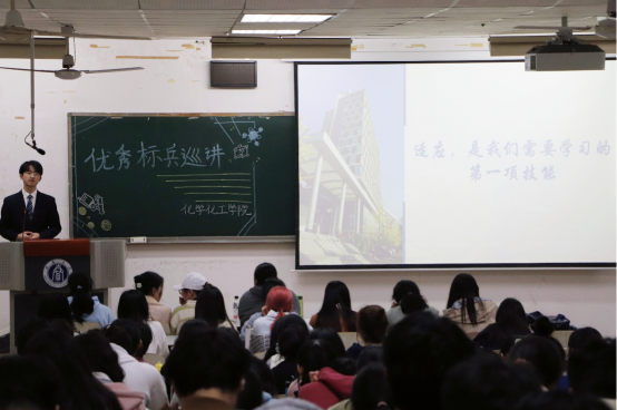 第三位进行宣讲的是来自物理科学与技术学院的徐伟。他以“适应、奋斗、选择”为主题,讲述自我经历,推荐学习方法,介绍考研保研准备条件,使同学们受益匪浅。徐伟同学语言风趣幽默,宣讲氛围轻松愉快。