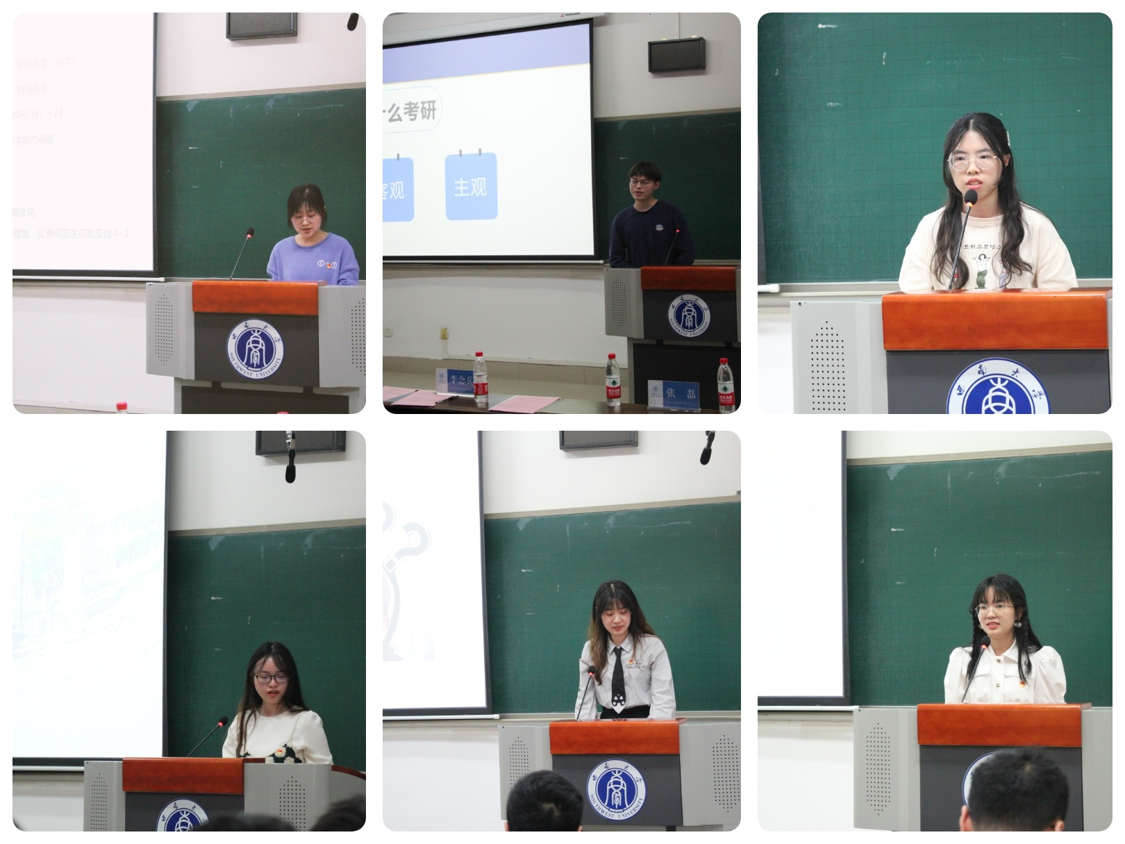 最后,分享人依次上台分享经验:考研至华南理工大学的薛璨同学结合自身考研经历分享了择校建议和获取考研学校信息的渠道;考研至本校的代渝同学介绍了考研本校的一些个人经历,鼓励大家坚持不懈但不封闭学习; 通过“卓越教师”计划保研至本校学科化学的夏丹同学对卓越教师计划的基本情况和申请流程做了系统的阐述; 考研至重庆大学的蓝俊麟同学就为什么要考研提出了自己的看法,介绍了重大的初试、复试流程;保研至中科院北化所的肖云芳同学对夏令营的情况做了具体介绍,并推荐了部分院校;考研至本校学科化学的唐恬同学介绍了学科化学专业的考研基本情况,并从报考准备、考试心态及时间调整等方面分享了自己的经验和建议。