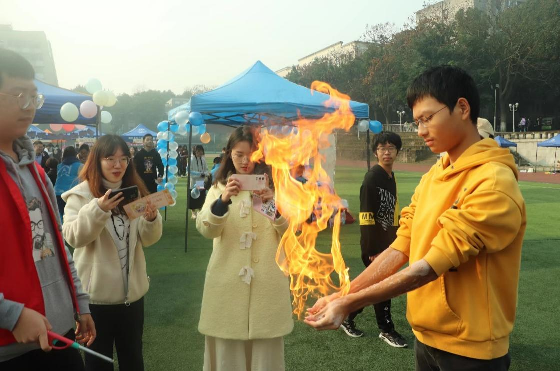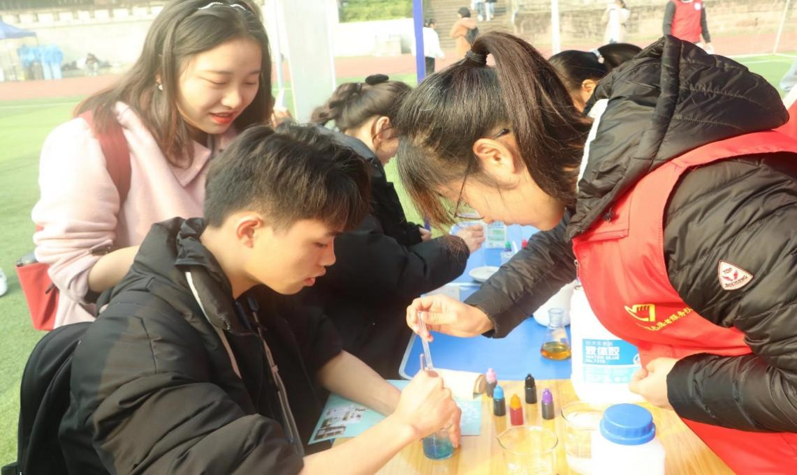“红灯停,绿灯行”,同学们将日常所见的红绿灯搬到眼前来,锥形瓶中缩小版的“红绿灯”随着手的摇晃呈现绿红黄颜色的交替变化。手中燃烧的火焰吸引参加游园的师生们驻足观看,大家跃跃欲试,给寒冷的冬日增添了许多温暖——工作人员讲解实验的身影和参与者实验中的探索形成了一道明媚的风景线。