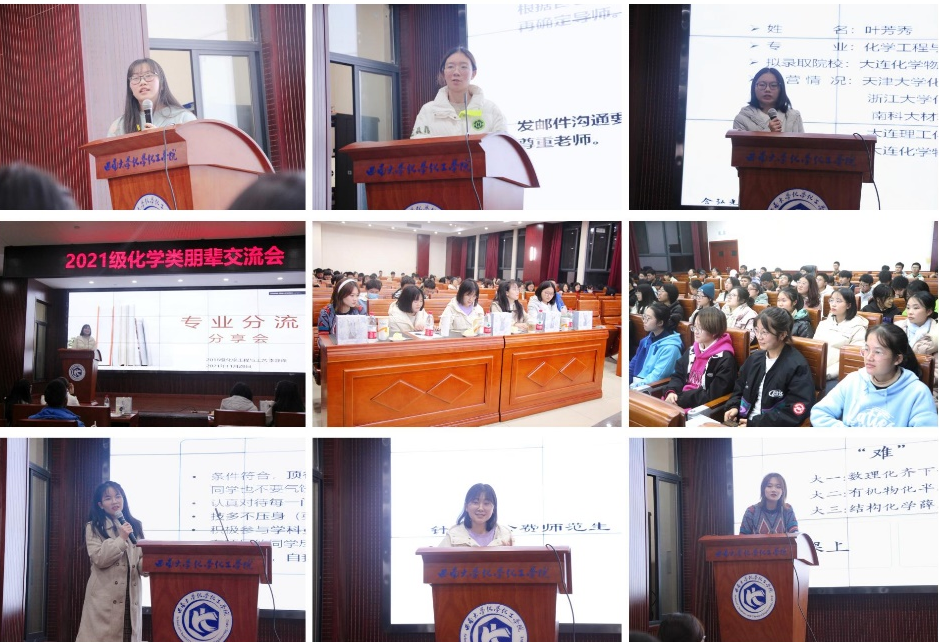 本次交流会由学生发展指导中心陈瑶主持。各位分享人依次上台分享交流经验:孙源分享了自己的学习方法,强调了要做一个有特色的、独立的人;李静烽介绍了化学类专业分流细则,对化类不同专业的培养目标、课程设置、毕业去向做了介绍;覃凌云就如何联系导师、开展独立项目分享了经验;肖云芳介绍了兰华班相关情况,并分享了应用化学专业保研经验;叶芳秀对化学工程与工艺专业保研情况做了具体介绍并给出了自己的一些建议;夏丹介绍了卓越教师计划并强调了自律的重要性;远在新加坡的孙哲成通过线上会议的方式介绍了出国留学方面应该注意的问题;郑家珠通过就业方向及就业准备两方面介绍了就业方面应该注意的事项。